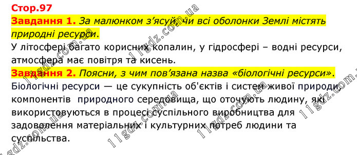 Завдання 1. За малюнком з’ясуй, чи всі оболонки Землі містять природні ресурси. У літосфері багато корисних копалин, у гідросфері – водні ресурси, атмосфера має повітря та кисень. Завдання 2. Поясни, з чим пов’язана назва «біологічні ресурси». Біологічні ресурси — це сукупність об'єктів і систем живої природи, компонентів природного середовища, що оточують людину, які використовуються в процесі суспільного виробництва для задоволення матеріальних і культурних потреб людини та суспільства.