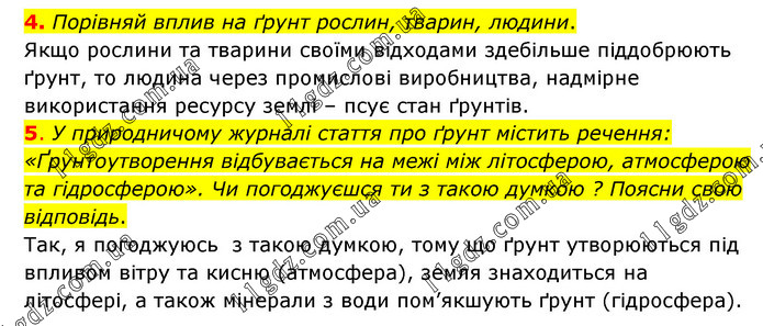 4. Порівняй вплив на ґрунт рослин, тварин, людини. Якщо рослини та тварини своїми відходами здебільше піддобрюють ґрунт, то людина через промислові виробництва, надмірне використання ресурсу землі – псує стан ґрунтів. 5. У природничому журналі стаття про ґрунт містить речення: «Ґрунтоутворення відбувається на межі між літосферою, атмосферою та гідросферою». Чи погоджуєшся ти з такою думкою ? Поясни свою відповідь. Так, я погоджуюсь з такою думкою, тому що ґрунт утворюються під впливом вітру та кисню (атмосфера), земля знаходиться на літосфері, а також мінерали з води пом’якшують ґрунт (гідросфера).
