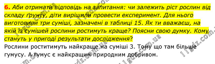 Аби отримати відповідь на запитання: чи залежить ріст рослин від складу ґрунту, діти вирішили провести експеримент. Для нього виготовили три суміші, зазначені в таблиці 15. Як ти вважаєш, на якій із сумішей рослини ростимуть краще? Поясни свою думку. Кому стануть у пригоді результати дослідження? Рослини роститимуть найкраще на суміші 3. Тому що там більше гумусу. А гумус є найкращим природним добривом.