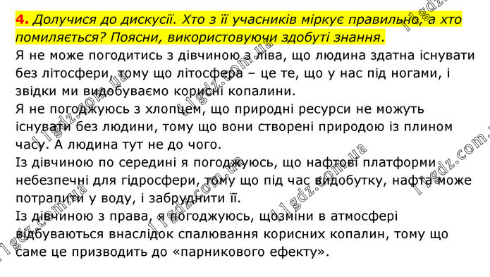 Долучися до дискусії. Хто з її учасників міркує правильно, а хто помиляється? Поясни, використовуючи здобуті знання. Я не може погодитись з дівчиною з ліва, що людина здатна існувати без літосфери, тому що літосфера – це те, що у нас під ногами, і звідки ми видобуваємо корисні копалини. Я не погоджуюсь з хлопцем, що природні ресурси не можуть існувати без людини, тому що вони створені природою із плином часу. А людина тут не до чого. Із дівчиною по середині я погоджуюсь, що нафтові платформи небезпечні для гідросфери, тому що під час видобутку, нафта може потрапити у воду, і забруднити її. Із дівчиною з права, я погоджуюсь, щозміни в атмосфері відбуваються внаслідок спалювання корисних копалин, тому що саме це призводить до «парникового ефекту».