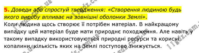 Доведи або спростуй твердження: «Створення людиною будь якого виробу впливає на зовнішні оболонки Землі». Коли людина щось створює її потрібен матеріал. В найкращому випадку цей матеріал буде мати природнє походження. Але навіть у такому випадку використовуються природні ресурси та корисні копалини, кількість яких на Землі поступово знижується.