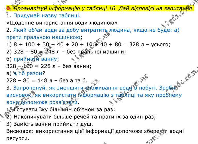 Проаналізуй інформацію у таблиці 16. Дай відповіді на запитання. 1. Придумай назву таблиці. «Щоденне використання води людиною» 2. Який об’єм води за добу витратить людина, якщо не буде: а) прати пральною машинкою; 1) 8 + 100 + 30 + 40 + 20 + 10 + 40 + 80 = 328 л – усього; 2) 328 – 80 = 248 л – без пральної машини; б) приймати ванну; 328 – 100 = 228 л – без ванни; в) а і б разом? 228 – 80 = 148 л – без а та б. 3. Запропонуй, як зменшити споживання води в побуті. Зроби висновок, як використати інформацію з таблиці та яку проблему вона допоможе розв’язати. 1) Готувати їжу більшим об’ємом за раз; 2) Накопичувати більше речей та прати їх за один раз; 3) Замість ванни приймати душ. Висновок: використання цієї інформації допоможе зберегти водні ресурси.