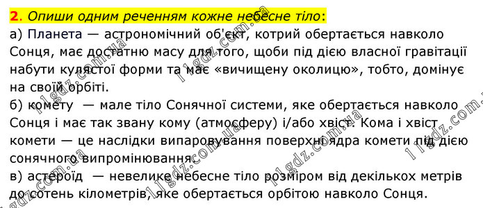 Опиши одним реченням кожне небесне тіло: а) Планета — астрономічний об'єкт, котрий обертається навколо Сонця, має достатню масу для того, щоби під дією власної гравітації набути кулястої форми та має «вичищену околицю», тобто, домінує на своїй орбіті. б) комету — мале тіло Сонячної системи, яке обертається навколо Сонця і має так звану кому (атмосферу) і/або хвіст. Кома і хвіст комети — це наслідки випаровування поверхні ядра комети під дією сонячного випромінювання. в) астероїд — невелике небесне тіло розміром від декількох метрів до сотень кілометрів, яке обертається орбітою навколо Сонця.