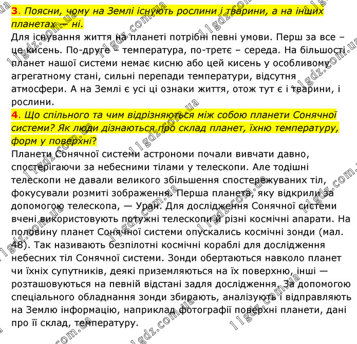 3. Поясни, чому на Землі існують рослини і тварини, а на інших планетах — ні. Для існування життя на планеті потрібні певні умови. Перш за все – це кисень. По-друге – температура, по-третє – середа. На більшості планет нашої системи немає кисню або цей кисень у особливому агрегатному стані, сильні перепади температури, відсутня атмосфери. А на Землі є усі ці ознаки життя, отож тут є і тварини, і рослини. 4. Що спільного та чим відрізняються між собою планети Сонячної системи? Як люди дізнаються про склад планет, їхню температуру, форм у поверхні? Планети Сонячної системи астрономи почали вивчати давно, спостерігаючи за небесними тілами у телескопи. Але тодішні телескопи не давали великого збільшення спостережуваних тіл, фокусували розмиті зображення. Перша планета, яку відкрили за допомогою телескопа, — Уран. Для дослідження Сонячної системи вчені використовують потужні телескопи й різні космічні апарати. На половину планет Сонячної системи опускались космічні зонди (мал. 48). Так називають безпілотні космічні кораблі для дослідження небесних тіл Сонячної системи. Зонди обертаються навколо планет чи їхніх супутників, деякі приземляються на їх поверхню, інші — розташовуються на певній відстані задля дослідження. За допомогою спеціального обладнання зонди збирають, аналізують і відправляють на Землю інформацію, наприклад фотографії поверхні планети, дані про її склад, температуру.