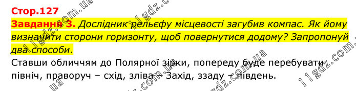 Завдання 3. Дослідник рельєфу місцевості загубив компас. Як йому визначити сторони горизонту, щоб повернутися додому? Запропонуй два способи. Ставши обличчям до Полярної зірки, попереду буде перебувати північ, праворуч – схід, зліва – Захід, ззаду – південь.