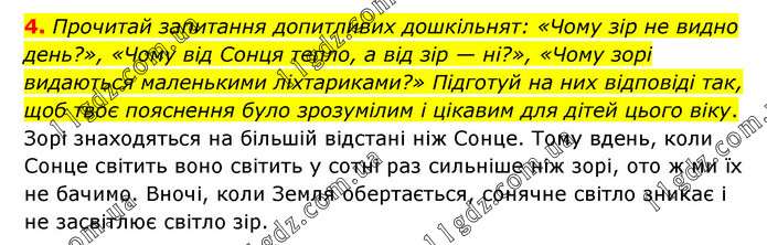 Прочитай запитання допитливих дошкільнят: «Чому зір не видно день?», «Чому від Сонця тепло, а від зір — ні?», «Чому зорі видаються маленькими ліхтариками?» Підготуй на них відповіді так, щоб твоє пояснення було зрозумілим і цікавим для дітей цього віку. Зорі знаходяться на більшій відстані ніж Сонце. Тому вдень, коли Сонце світить воно світить у сотні раз сильніше ніж зорі, ото ж ми їх не бачимо. Вночі, коли Земля обертається, сонячне світло зникає і не засвітлює світло зір.