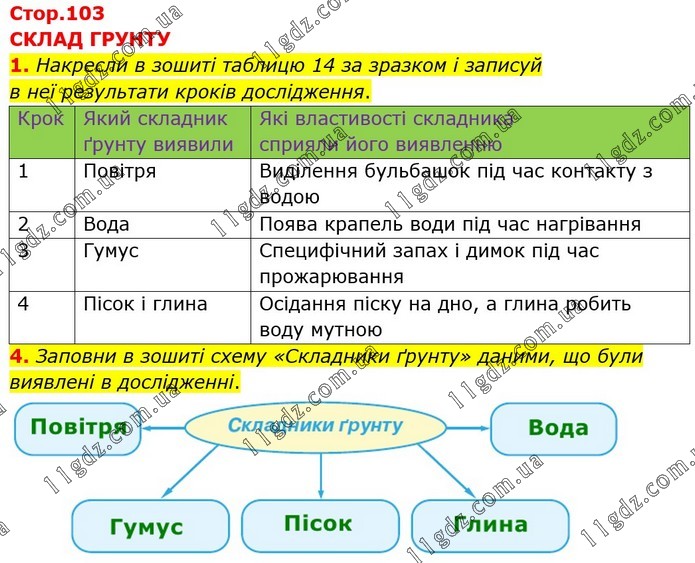 1. Накресли в зошиті таблицю 14 за зразком і записуй в неї результати кроків дослідження. Крок Який складник ґрунту виявили Які властивості складника сприяли його виявленню 1 Повітря Виділення бульбашок під час контакту з водою 2 Вода Поява крапель води під час нагрівання 3 Гумус Специфічний запах і димок під час прожарювання 4 Пісок і глина Осідання піску на дно, а глина робить воду мутною 4. Заповни в зошиті схему «Складники ґрунту» даними, що були виявлені в дослідженні.