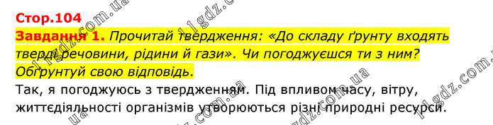 Завдання 1. Прочитай твердження: «До складу ґрунту входять тверді речовини, рідини й гази». Чи погоджуєшся ти з ним? Обґрунтуй свою відповідь. Так, я погоджуюсь з твердженням. Під впливом часу, вітру, життєдіяльності організмів утворюються різні природні ресурси.