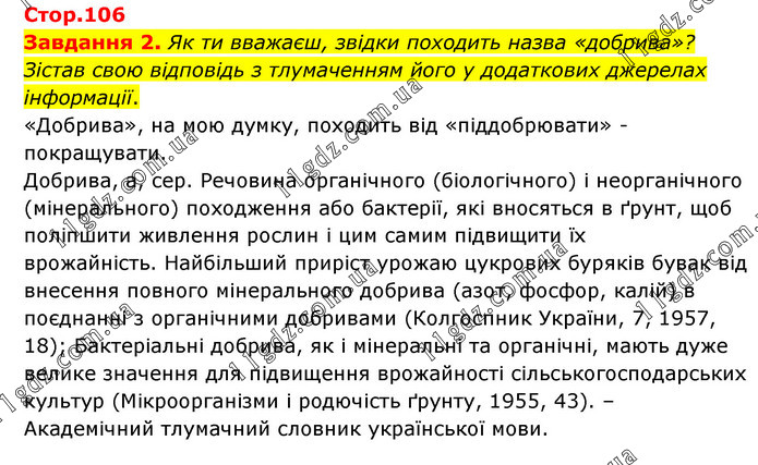 Завдання 2. Як ти вважаєш, звідки походить назва «добрива»? Зістав свою відповідь з тлумаченням його у додаткових джерелах інформації. «Добрива», на мою думку, походить від «піддобрювати» - покращувати. Добрива, а, сер. Речовина органічного (біологічного) і неорганічного (мінерального) походження або бактерії, які вносяться в ґрунт, щоб поліпшити живлення рослин і цим самим підвищити їх врожайність. Найбільший приріст урожаю цукрових буряків бувак від внесення повного мінерального добрива (азот, фосфор, калій) в поєднанні з органічними добривами (Колгоспник України, 7, 1957, 18); Бактеріальні добрива, як і мінеральні та органічні, мають дуже велике значення для підвищення врожайності сільськогосподарських культур (Мікроорганізми і родючість ґрунту, 1955, 43). – Академічний тлумачний словник української мови.