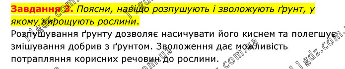 Завдання 3. Поясни, навіщо розпушують і зволожують ґрунт, у якому вирощують рослини. Розпушування ґрунту дозволяє насичувати його киснем та полегшує змішування добрив з ґрунтом. Зволоження дає можливість потрапляння корисних речовин до рослини.