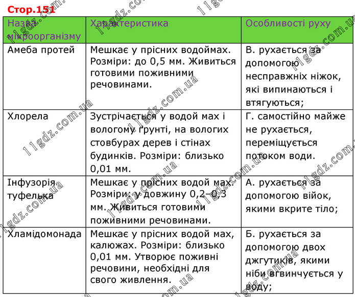 Назва мікроорганізму Характеристика Особливості руху Амеба протей Мешкає у прісних водоймах. Розміри: до 0,5 мм. Живиться готовими поживними речовинами. В. рухається за допомогою несправжніх ніжок, які випинаються і втягуються; Хлорела Зустрічається у водой мах і вологому ґрунті, на вологих стовбурах дерев і стінах будинків. Розміри: близько 0,01 мм. Г. самостійно майже не рухається, переміщується потоком води. Інфузорія туфелька Мешкає у прісних водой мах. Розміри: у довжину 0,2–0,3 мм. Живиться готовими поживними речовинами. А. рухається за допомогою війок, якими вкрите тіло; Хламідомонада Мешкає у прісних водой мах, калюжах. Розміри: близько 0,01 мм. Утворює поживні речовини, необхідні для свого живлення. Б. рухається за допомогою двох джгутиків, якими ніби вгвинчується у воду;