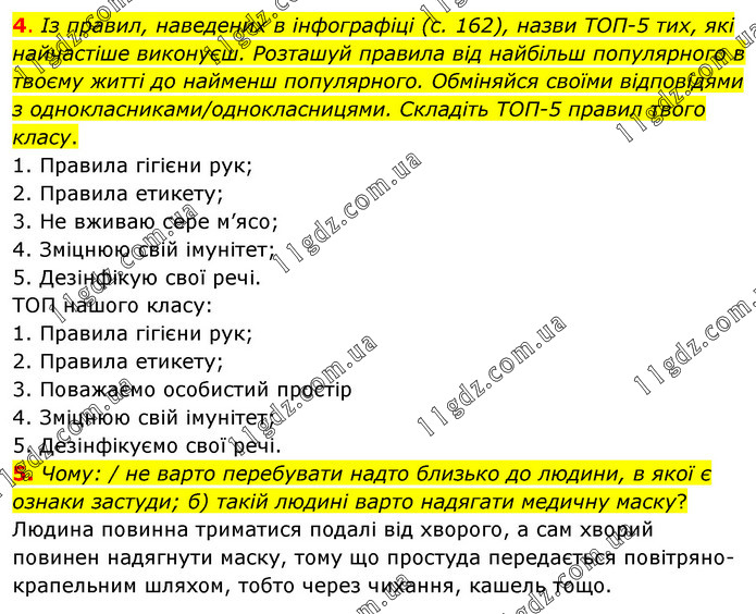 4. Із правил, наведених в інфографіці (с. 162), назви ТОП-5 тих, які найчастіше виконуєш. Розташуй правила від найбільш популярного в твоєму житті до найменш популярного. Обміняйся своїми відповідями з однокласниками/однокласницями. Складіть ТОП-5 правил твого класу. 1. Правила гігієни рук; 2. Правила етикету; 3. Не вживаю сере м’ясо; 4. Зміцнюю свій імунітет; 5. Дезінфікую свої речі. ТОП нашого класу: 1. Правила гігієни рук; 2. Правила етикету; 3. Поважаємо особистий простір 4. Зміцнюю свій імунітет; 5. Дезінфікуємо свої речі. 5. Чому: / не варто перебувати надто близько до людини, в якої є ознаки застуди; б) такій людині варто надягати медичну маску? Людина повинна триматися подалі від хворого, а сам хворий повинен надягнути маску, тому що простуда передається повітряно-крапельним шляхом, тобто через чихання, кашель тощо.
