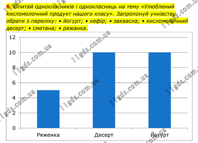 Опитай однокласників і однокласниць на тему «Улюблений кисломолочний продукт нашого класу». Запропонуй учнівству обрати з переліку: • йогурт; • кефір; • закваска; • кисломолочний десерт; • сметана; • ряжанка.
