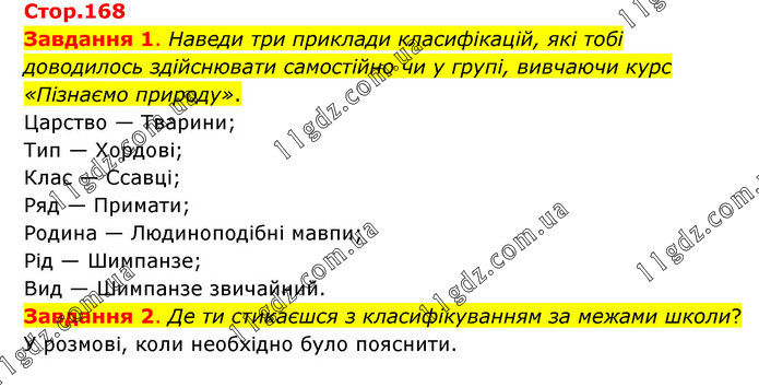 Завдання 1. Наведи три приклади класифікацій, які тобі доводилось здійснювати самостійно чи у групі, вивчаючи курс «Пізнаємо природу». Царство — Тварини; Тип — Хордові; Клас — Ссавці; Ряд — Примати; Родина — Людиноподібні мавпи; Рід — Шимпанзе; Вид — Шимпанзе звичайний. Завдання 2. Де ти стикаєшся з класифікуванням за межами школи? У розмові, коли необхідно було пояснити.