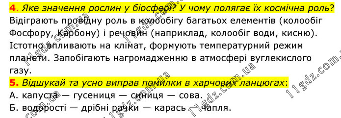 4. Яке значення рослин у біосфері? У чому полягає їх космічна роль? Відіграють провідну роль в колообігу багатьох елементів (колообіг Фосфору, Карбону) і речовин (наприклад, колообіг води, кисню). Істотно впливають на клімат, формують температурний режим планети. Запобігають нагромадженню в атмосфері вуглекислого газу. 5. Відшукай та усно виправ помилки в харчових ланцюгах: А. капуста — гусениця — синиця — сова. Б. водорості — дрібні рачки — карась — чапля.