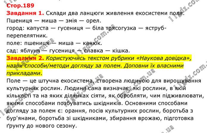 Завдання 1. Склади два ланцюги живлення екосистеми поля. Пшениця — миша — змія — орел. город: капуста — гусениця — біла трясогузка — яструб-перепелятник. поле: пшениця — миша — канюк. сад: яблуня — гусениця — славка — кішка. Завдання 2. Користуючись текстом рубрики «Наукова довідка», назви способи/методи догляду за полем. Доповни їх власними прикладами. Поле — це штучна екосистема, створена людиною для вирощування культурних рослин. Людина сама визначає, які рослини, в якій кількості та на яких ділянках сіяти, як обробляти, чим підживлювати, якими способами позбуватись шкідників. Основними способами догляду за полем є: орання, посів культурних рослин, боротьба з бур'янами, боротьба зі шкідниками, збирання врожаю, підготовка ґрунту до нового сезону.