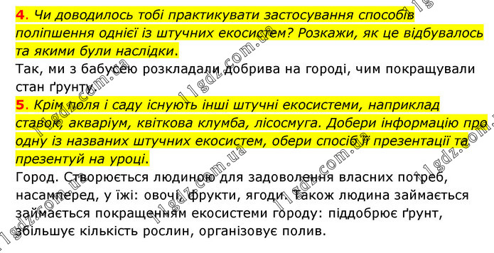 4. Чи доводилось тобі практикувати застосування способів поліпшення однієї із штучних екосистем? Розкажи, як це відбувалось та якими були наслідки. Так, ми з бабусею розкладали добрива на городі, чим покращували стан ґрунту. 5. Крім поля і саду існують інші штучні екосистеми, наприклад ставок, акваріум, квіткова клумба, лісосмуга. Добери інформацію про одну із названих штучних екосистем, обери спосіб її презентації та презентуй на уроці. Город. Створюється людиною для задоволення власних потреб, насамперед, у їжі: овочі, фрукти, ягоди. Також людина займається займається покращенням екосистеми городу: піддобрює ґрунт, збільшує кількість рослин, організовує полив.