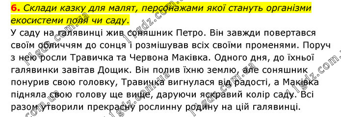 Склади казку для малят, персонажами якої стануть організми екосистеми поля чи саду. У саду на галявинці жив соняшник Петро. Він завжди повертався своїм обличчям до сонця і розмішував всіх своїми променями. Поруч з нею росли Травичка та Червона Маківка. Одного дня, до їхньої галявинки завітав Дощик. Він полив їхню землю, але соняшник понурив свою головку, Травичка вигнулася від радості, а Маківка підняла свою голову ще вище, даруючи яскравий колір саду. Всі разом утворили прекрасну рослинну родину на цій галявинці.