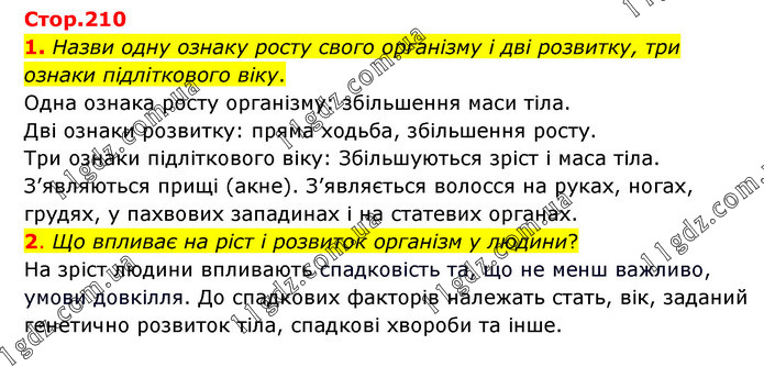 1. Назви одну ознаку росту свого організму і дві розвитку, три ознаки підліткового віку. Одна ознака росту організму: збільшення маси тіла. Дві ознаки розвитку: пряма ходьба, збільшення росту. Три ознаки підліткового віку: Збільшуються зріст і маса тіла. З’являються прищі (акне). З’являється волосся на руках, ногах, грудях, у пахвових западинах і на статевих органах. 2. Що впливає на ріст і розвиток організм у людини? На зріст людини впливають спадковість та, що не менш важливо, умови довкілля. До спадкових факторів належать стать, вік, заданий генетично розвиток тіла, спадкові хвороби та інше.