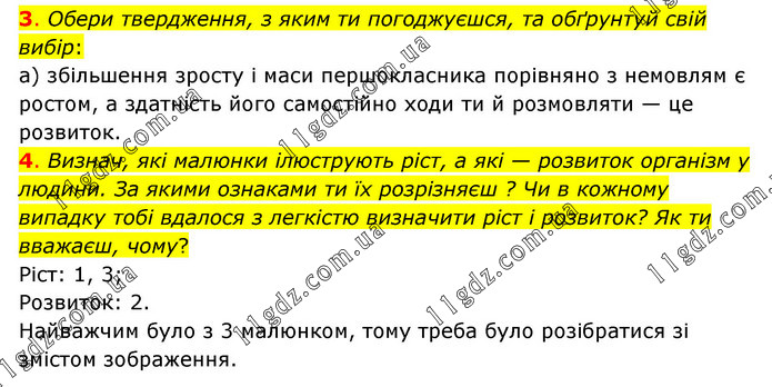 3. Обери твердження, з яким ти погоджуєшся, та обґрунтуй свій вибір: а) збільшення зросту і маси першокласника порівняно з немовлям є ростом, а здатність його самостійно ходи ти й розмовляти — це розвиток. 4. Визнач, які малюнки ілюструють ріст, а які — розвиток організм у людини. За якими ознаками ти їх розрізняєш ? Чи в кожному випадку тобі вдалося з легкістю визначити ріст і розвиток? Як ти вважаєш, чому? Ріст: 1, 3; Розвиток: 2. Найважчим було з 3 малюнком, тому треба було розібратися зі змістом зображення.