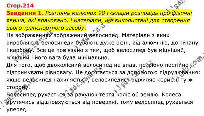 Завдання 1. Розглянь малюнок 98 і склади розповідь про фізичні явища, які враховано, і матеріали, що використані для створення цього транспортного засобу. На зображеннях зображений велосипед. Матеріали з яких виробляють велосипеди бувають дуже різні, від алюмінію, до титану і карбону. Все це пов’язано з тим, щоб велосипед був міцніший, м’якший і його вага була мінімально. Для того, щоб двоколісний велосипед не впав, потрібно постійно підтримувати рівновагу. Це досягається за допомогою підрулювання: якщо велосипед нахиляється, велосипедист відхиляє кермо в ту ж сторону. Велосипед рухається за рахунок тертя коліс об землю. Колеса крутячись відштовхуються від поверхні, тому велосипед рухається уперед.