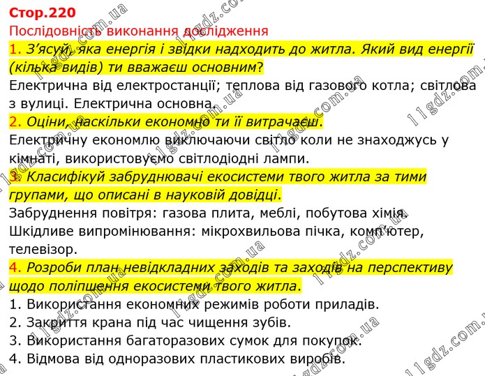 Послідовність виконання дослідження 1. З’ясуй, яка енергія і звідки надходить до житла. Який вид енергії (кілька видів) ти вважаєш основним? Електрична від електростанції; теплова від газового котла; світлова з вулиці. Електрична основна. 2. Оціни, наскільки економно ти її витрачаєш. Електричну економлю виключаючи світло коли не знаходжусь у кімнаті, використовуємо світлодіодні лампи. 3. Класифікуй забруднювачі екосистеми твого житла за тими групами, що описані в науковій довідці. Забруднення повітря: газова плита, меблі, побутова хімія. Шкідливе випромінювання: мікрохвильова пічка, комп’ютер, телевізор. 4. Розроби план невідкладних заходів та заходів на перспективу щодо поліпшення екосистеми твого житла. 1. Використання економних режимів роботи приладів. 2. Закриття крана під час чищення зубів. 3. Використання багаторазових сумок для покупок. 4. Відмова від одноразових пластикових виробів.
