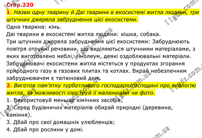 1. Назви одну тварину й Дві тварини в екосистемі житла людини, три штучних джерела забруднення цієї екосистеми. Одна тварина: кінь. Дві тварини в екосистемі житла людини: кішка, собака. Три штучних джерела забруднення цієї екосистеми: Забруднюють повітря отруйні речовини, що виділяються штучними матеріалами, з яких виготовлено меблі, лінолеум, деякі оздоблювальні матеріали. Забруднювачі екосистеми житла містяться у продуктах згорання природного газу в газових плитах та котлах. Вкрай небезпечним забруднювачем є тютюновий дим. 2. Виготов пам’ятку турботливого господаря/господині про екологію житла, за можливості ілюструй її малюнками чи фото. 1. Використовуй меньше хімічних засобів; 2. Серед будівничих матеріалів обирай природні (деревина, каміння). 3. Дбай про свої домашніх улюбленців; 4. Дбай про рослини у домі.