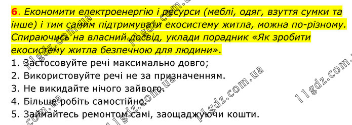 Економити електроенергію і ресурси (меблі, одяг, взуття сумки та інше) і тим самим підтримувати екосистему житла, можна по-різному. Спираючись на власний досвід, уклади порадник «Як зробити екосистему житла безпечною для людини». 1. Застосовуйте речі максимально довго; 2. Використовуйте речі не за призначенням. 3. Не викидайте нічого зайвого. 4. Більше робіть самостійно. 5. Займайтесь ремонтом самі, заощаджуючи кошти.