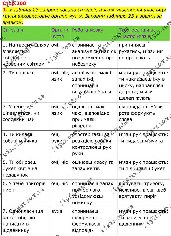У таблиці 23 запропоновано ситуації, в яких учасник чи учасниця групи використовує органи чуття. Заповни таблицю 23 у зошиті за зразком.