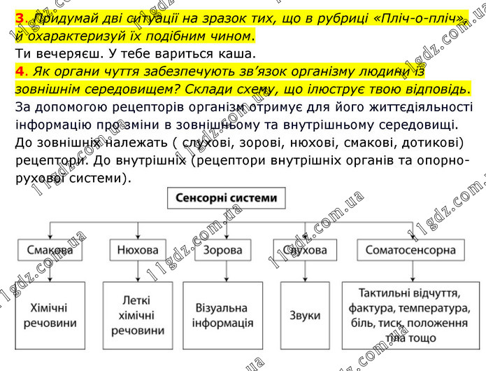 3. Придумай дві ситуації на зразок тих, що в рубриці «Пліч-о-пліч», й охарактеризуй їх подібним чином. Ти вечеряєш. У тебе вариться каша. 4. Як органи чуття забезпечують зв’язок організму людини із зовнішнім середовищем? Склади схему, що ілюструє твою відповідь. За допомогою рецепторів організм отримує для його життєдіяльності інформацію про зміни в зовнішньому та внутрішньому середовищі. До зовнішніх належать ( слухові, зорові, нюхові, смакові, дотикові) рецептори. До внутрішніх (рецептори внутрішніх органів та опорно-рухової системи).