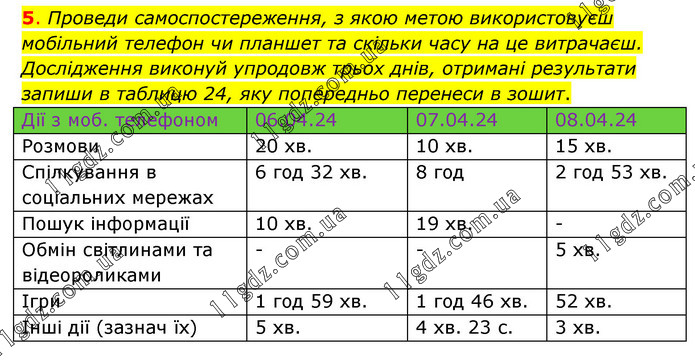 Проведи самоспостереження, з якою метою використовуєш мобільний телефон чи планшет та скільки часу на це витрачаєш. Дослідження виконуй упродовж трьох днів, отримані результати запиши в таблицю 24, яку попередньо перенеси в зошит.