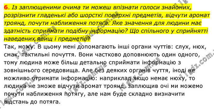 Із заплющеними очима ти можеш впізнати голоси знайомих, розрізнити гладенькі або шорсткі поверхні предметів, відчути аромат троянд, почути наближення потяга. Яке значення для людини має здатність сприймати подібну інформацію? Що спільного у сприйнятті наведених явищ і предметів? Так, можу. В цьому мені допомагають інші органи чуттів: слух, нюх, смак, тактильні почуття. Вони частково доповнюють один одного, тому людина може більш детально сприймати інформацію з зовнішнього середовища. Але без деяких органів чуття, іноді не можливо отримати інформацію: наприклад якщо немає нюху, то людина не зможе відчути аромат троянд, заплющив очі ми можемо почути наближення потягу, але нам буде складно визначити відстань до потяга.