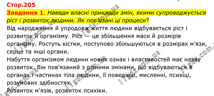 Завдання 1. Наведи власні приклади змін, якими супроводжується ріст і розвиток людини. Як пов’язані ці процеси? Від народження й упродовж життя людини відбувається ріст і розвиток її організму. Ріст — це збільшення маси й розмірів організму. Ростуть кістки, поступово збільшуються в розмірах м’язи, серце та інші органи. Набуття організмом людини нових ознак і властивостей має назву розвиток. Він пов’язаний з різними змінами, що відбуваються в органах і частинах тіла людини, її поведінці, мисленні, психіці, розумових здібностях. Розвиток м'язів, розвиток психіки.