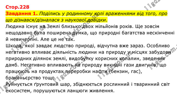 Завдання 1. Поділись у родинному колі враженнями від того, про що дізнався/дізналася з наукової довідки. Людина існує на Землі близько двох мільйонів років. Ще зовсім нещодавно була поширена думка, що природні багатства нескінченні й невичерпні. Але це не так. Шкода, якої завдає людство природі, відчутна вже зараз. Особливо негативно впливає діяльність людини на природу у місцях забудови природних ділянок землі, видобутку корисних копалин, зведення дамб. Негативно впливають на природу викидні гази двигунів, що працюють на продуктах переробки нафти (бензин, гас), браконьєрство тощо. Руйнується ґрунтовий шар, збіднюється рослинний і тваринний світ екосистем, порушуються ланцюги живлення.