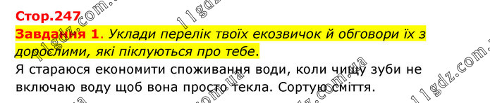 Завдання 1. Уклади перелік твоїх екозвичок й обговори їх з дорослими, які піклуються про тебе. Я стараюся економити споживання води, коли чищу зуби не включаю воду щоб вона просто текла. Сортую сміття.