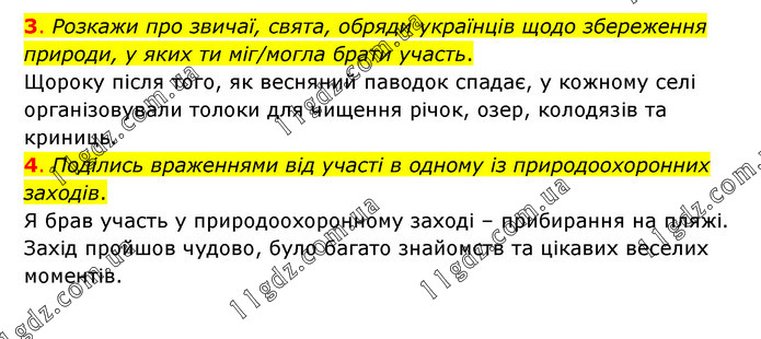 3. Розкажи про звичаї, свята, обряди українців щодо збереження природи, у яких ти міг/могла брати участь. Щороку після того, як весняний паводок спадає, у кожному селі організовували толоки для чищення річок, озер, колодязів та криниць. 4. Поділись враженнями від участі в одному із природоохоронних заходів. Я брав участь у природоохоронному заході – прибирання на пляжі. Захід пройшов чудово, було багато знайомств та цікавих веселих моментів.