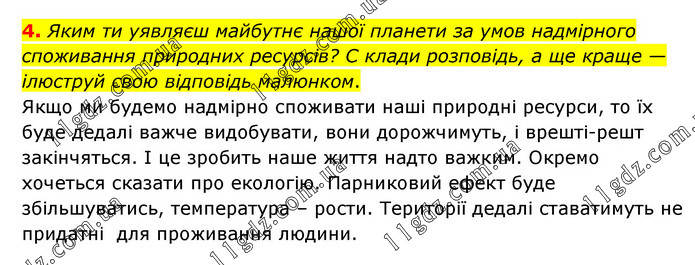 Яким ти уявляєш майбутнє нашої планети за умов надмірного споживання природних ресурсів? С клади розповідь, а ще краще — ілюструй свою відповідь малюнком. Якщо ми будемо надмірно споживати наші природні ресурси, то їх буде дедалі важче видобувати, вони дорожчимуть, і врешті-решт закінчяться. І це зробить наше життя надто важким. Окремо хочеться сказати про екологію. Парниковий ефект буде збільшуватись, температура – рости. Території дедалі ставатимуть не придатні для проживання людини.
