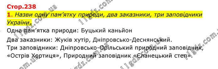 Назви одну пам’ятку природи, два заказники, три заповідники України. • Одна пам’ятка природи: Буцький каньйон Два заказники: Жуків хутір, Дніпровсько-Деснянський. Три заповідники: Дніпровсько-Орільський природний заповідник, «Острів Хортиця», Природний заповідник «Єланецький степ».