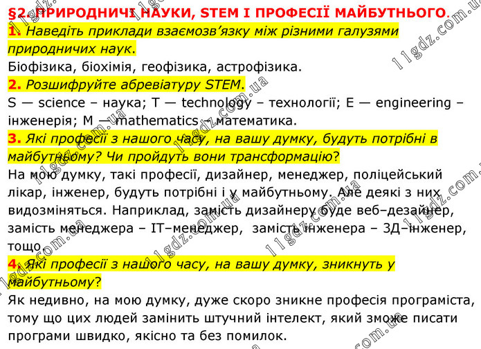 §2. ПРИРОДНИЧІ НАУКИ, STEM І ПРОФЕСІЇ МАЙБУТНЬОГО. 1. Наведіть приклади взаємозв’язку між різними галузями природничих наук. Біофізика, біохімія, геофізика, астрофізика. 2. Розшифруйте абревіатуру STEM. S — science – наука; T — technology – технології; E — engineering – інженерія; M — mathematics – математика. 3. Які професії з нашого часу, на вашу думку, будуть потрібні в майбутньому? Чи пройдуть вони трансформацію? На мою думку, такі професії, дизайнер, менеджер, поліцейський лікар, інженер, будуть потрібні і у майбутньому. Але деякі з них видозміняться. Наприклад, замість дизайнеру буде веб–дезайнер, замість менеджера – ІТ–менеджер, замість інженера – 3Д–інженер, тощо. 4. Які професії з нашого часу, на вашу думку, зникнуть у майбутньому? Як недивно, на мою думку, дуже скоро зникне професія програміста, тому що цих людей замінить штучний інтелект, який зможе писати програми швидко, якісно та без помилок.