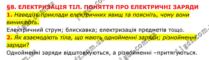 §8. ЕЛЕКТРИЗАЦІЯ ТІЛ. ПОНЯТТЯ ПРО ЕЛЕКТРИЧНІ ЗАРЯДИ 1. Наведіть приклади електричних явищ та поясніть, чому вони виникають. Електричний струм; блискавка; електризація предметів тощо. 2. Як взаємодіють тіла, що мають однойменні заряди; різнойменні заряди? Однойменні заряди відштовхуються, а різнойменні – притягуються.