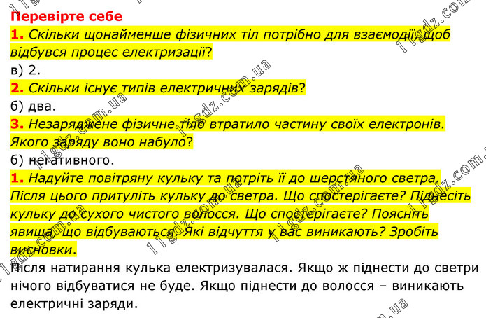 Перевірте себе 1. Скільки щонайменше фізичних тіл потрібно для взаємодії, щоб відбувся процес електризації? в) 2. 2. Скільки існує типів електричних зарядів? б) два. 3. Незаряджене фізичне тіло втратило частину своїх електронів. Якого заряду воно набуло? б) негативного. 1. Надуйте повітряну кульку та потріть її до шерстяного светра. Після цього притуліть кульку до светра. Що спостерігаєте? Піднесіть кульку до сухого чистого волосся. Що спостерігаєте? Поясніть явища, що відбуваються. Які відчуття у вас виникають? Зробіть висновки. Після натирання кулька електризувалася. Якщо ж піднести до светри нічого відбуватися не буде. Якщо піднести до волосся – виникають електричні заряди.