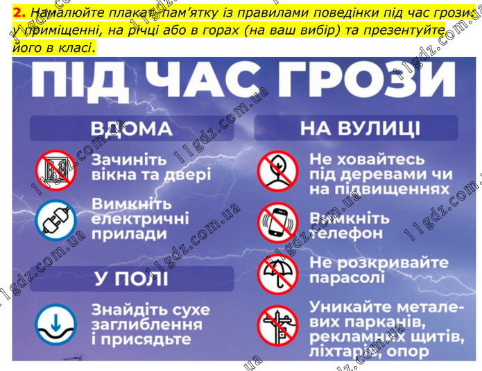 Намалюйте плакат–пам’ятку із правилами поведінки під час грози: у приміщенні, на річці або в горах (на ваш вибір) та презентуйте його в класі.