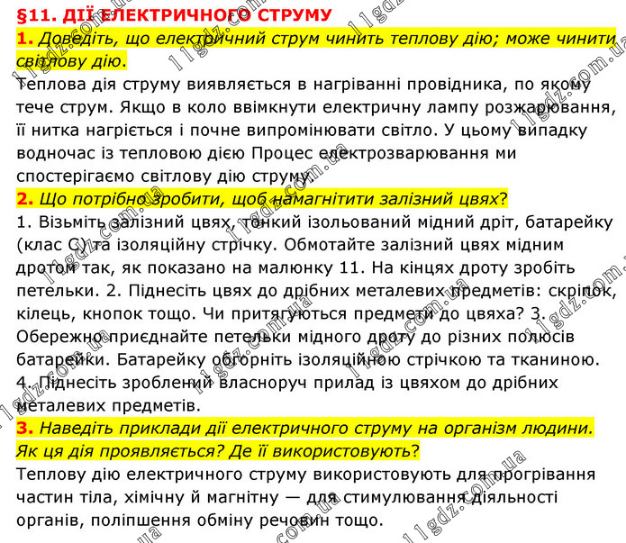 §11. ДІЇ ЕЛЕКТРИЧНОГО СТРУМУ 1. Доведіть, що електричний струм чинить теплову дію; може чинити світлову дію. Теплова дія струму виявляється в нагріванні провідника, по якому тече струм. Якщо в коло ввімкнути електричну лампу розжарювання, її нитка нагріється і почне випромінювати світло. У цьому випадку водночас із тепловою дією Процес електрозварювання ми спостерігаємо світлову дію струму. 2. Що потрібно зробити, щоб намагнітити залізний цвях? 1. Візьміть залізний цвях, тонкий ізольований мідний дріт, батарейку (клас С) та ізоляційну стрічку. Обмотайте залізний цвях мідним дротом так, як показано на малюнку 11. На кінцях дроту зробіть петельки. 2. Піднесіть цвях до дрібних металевих предметів: скріпок, кілець, кнопок тощо. Чи притягуються предмети до цвяха? 3. Обережно приєднайте петельки мідного дроту до різних полюсів батарейки. Батарейку обгорніть ізоляційною стрічкою та тканиною. 4. Піднесіть зроблений власноруч прилад із цвяхом до дрібних металевих предметів. 3. Наведіть приклади дії електричного струму на організм людини. Як ця дія проявляється? Де її використовують? Теплову дію електричного струму використовують для прогрівання частин тіла, хімічну й магнітну — для стимулювання діяльності органів, поліпшення обміну речовин тощо.