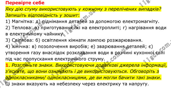 Перевірте себе Яку дію стуму використовують у кожному з перелічених випадків? Запишіть відповідність у зошит: 1) Магнітна: д) піднімання деталей за допомогою електромагніту. 2) Теплова: а) приготування їжі на електроплиті; г) нагрівання води в електричному чайнику. 3) Світлова: б) освітлення кімнати лампою розжарювання. 4) хімічна: в) позолочення виробів; е) зварювання деталей; є) утворення газу внаслідок розкладання води в розчині кухонної солі під час пропускання електричного струму. 1. Розгляньте знаки. Використовуючи додаткові джерела інформації, з’ясуйте, що вони означають і де використовуються. Обговоріть з однокласниками/ однокласницями, де ви могли бачити такі знаки. Ці знаки вказують на небезпеку через електрику та напругу.