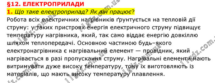 §12. ЕЛЕКТРОПРИЛАДИ 1. Що таке електроприлад? Як він працює? Робота всіх електричних нагрівників ґрунтується на тепловій дії струму: у таких пристроях енергія електричного струму підвищує температуру нагрівника, який, так само віддає енергію довкіллю шляхом теплопередачі. Основною частиною будь–якого електронагрівника є нагрівальний елемент — провідник, який нагрівається в разі пропускання струму. Нагрівальні елементи мають витримувати дуже високу температуру, тому їх виготовляють із матеріалів, що мають високу температуру плавлення.
