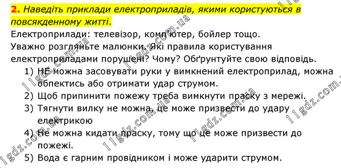 Наведіть приклади електроприладів, якими користуються в повсякденному житті. Електроприлади: телевізор, комп’ютер, бойлер тощо. Уважно розгляньте малюнки. Які правила користування електроприладами порушені? Чому? Обґрунтуйте свою відповідь. 1) НЕ можна засовувати руки у вимкнений електроприлад, можна обпектись або отримати удар струмом. 2) Щоб припинити пожежу треба вимкнути праску з мережі. 3) Тягнути вилку не можна, це може призвести до удару електрикою 4) Не можна кидати праску, тому що це може призвести до пожежі. 5) Вода є гарним провідником і може ударити струмом.