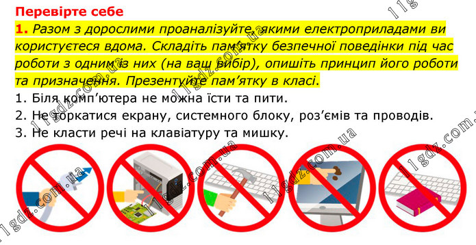 Перевірте себе 1. Разом з дорослими проаналізуйте, якими електроприладами ви користуєтеся вдома. Складіть пам’ятку безпечної поведінки під час роботи з одним із них (на ваш вибір), опишіть принцип його роботи та призначення. Презентуйте пам’ятку в класі. 1. Біля комп’ютера не можна їсти та пити. 2. Не торкатися екрану, системного блоку, роз’ємів та проводів. 3. Не класти речі на клавіатуру та мишку.