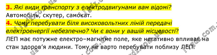 3. Які види транспорту з електродвигунами вам відомі? Автомобіль, скутер, самокат. 4. Чому перебувати біля високовольтних ліній передачі електроенергії небезпечно? Чи є вони у вашій місцевості? ЛЕП має потужне електро–магнітне поле, яке негативно впливає на стан здоров’я людини. Тому не варто перебувати поблизу ЛЕП.