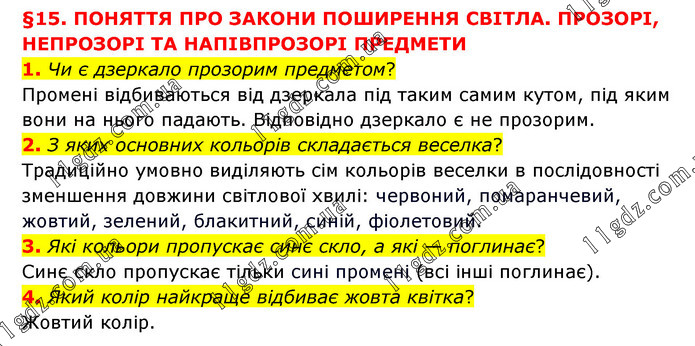 §15. ПОНЯТТЯ ПРО ЗАКОНИ ПОШИРЕННЯ СВІТЛА. ПРОЗОРІ, НЕПРОЗОРІ ТА НАПІВПРОЗОРІ ПРЕДМЕТИ 1. Чи є дзеркало прозорим предметом? Промені відбиваються від дзеркала під таким самим кутом, під яким вони на нього падають. Відповідно дзеркало є не прозорим. 2. З яких основних кольорів складається веселка? Традиційно умовно виділяють сім кольорів веселки в послідовності зменшення довжини світлової хвилі: червоний, помаранчевий, жовтий, зелений, блакитний, синій, фіолетовий. 3. Які кольори пропускає синє скло, а які — поглинає? Синє скло пропускає тільки сині промені (всі інші поглинає). 4. Який колір найкраще відбиває жовта квітка? Жовтий колір.