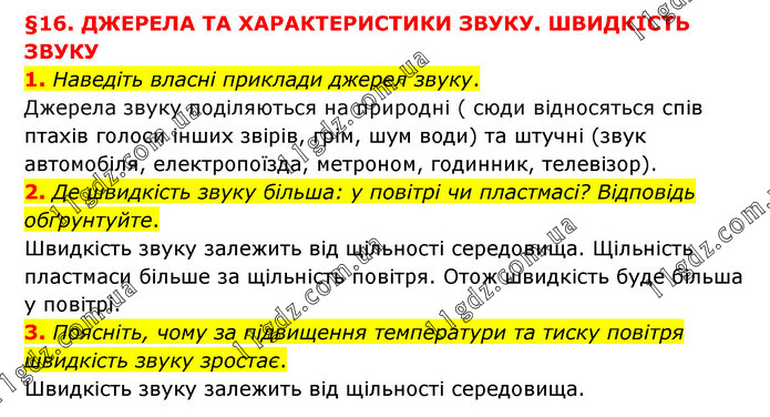 §16. ДЖЕРЕЛА ТА ХАРАКТЕРИСТИКИ ЗВУКУ. ШВИДКІСТЬ ЗВУКУ 1. Наведіть власні приклади джерел звуку. Джерела звуку поділяються на природні ( сюди відносяться спів птахів голоси інших звірів, грім, шум води) та штучні (звук автомобіля, електропоїзда, метроном, годинник, телевізор). 2. Де швидкість звуку більша: у повітрі чи пластмасі? Відповідь обґрунтуйте. Швидкість звуку залежить від щільності середовища. Щільність пластмаси більше за щільність повітря. Отож швидкість буде більша у повітрі. 3. Поясніть, чому за підвищення температури та тиску повітря швидкість звуку зростає. Швидкість звуку залежить від щільності середовища.